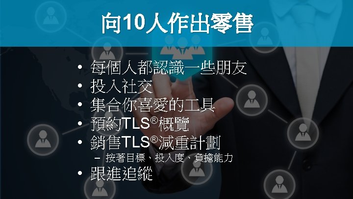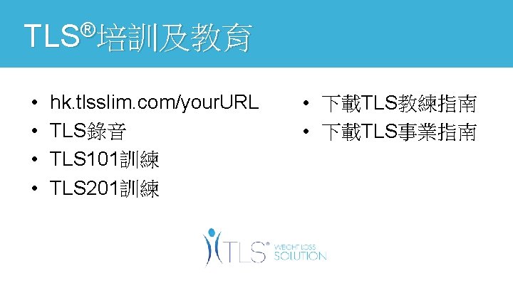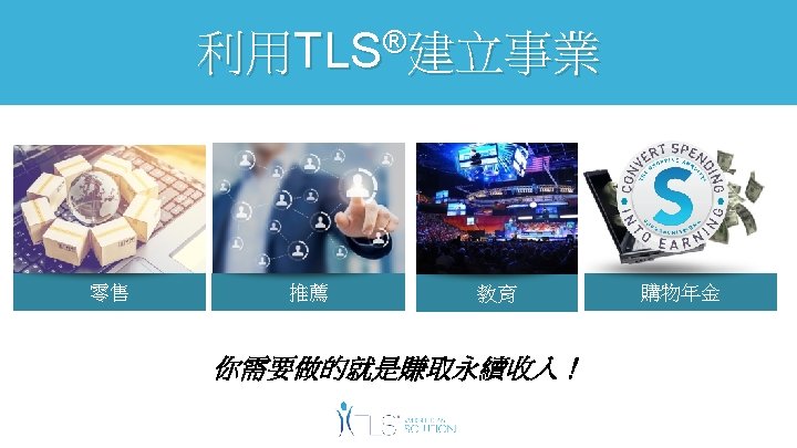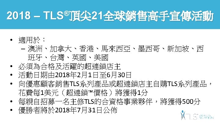 利用TLS達成事業目標 Reach Your Goals With TLS Emmy Yeung 產品拓展經理 Product Marketing Manager Calvin Ip 高級顧問經理級 Director 四個佣金週期共賺取HK$138, 000 in 4 Commission weeks 本簡報中提到的收入等級純屬舉例說明,無意代表美安香港超連鎖™店主的一般收入,也無意表示任何超連鎖™店主皆可賺取同等收入。美安香港超連鎖™店主的 成功與否,取決於其在發展事業時的努力、才能與投入程度。 The income levels mentioned in the following presentation are for illustration purposes only. They are not intended to represent the income of a typical Market Hong Kong Un. Franchise ™Owner, nor are they intended to represent that any given Independent Un. Franchise ™ Owner will earn income in that amount. The success of any Market Hong Kong Independent Un. Franchise ™ Owner will depend upon the amount of hard work, talent, and dedication which he or she devotes to building his or her Market
