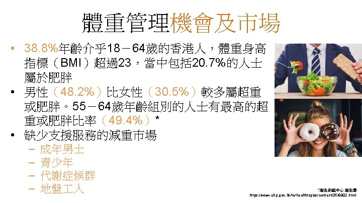 體重管理;財政責任 目前每年糖尿病的醫療保健費約為 20億港元, 其中約一半與成年人的超重和肥胖有關。 SM Mc. Ghee *, GN Thomas, CM Schooling, J Chau, LC Wong. Economic burden of diabetes related to excess body weight in Hong Kong Med J 2014; 20(Suppl 3): S 5 -7