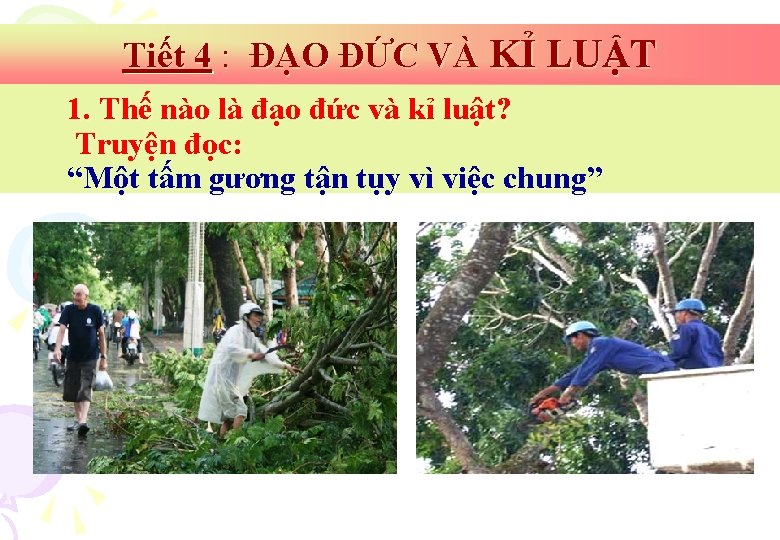 TIẾT 4: ĐẠO ĐỨC VÀ KỈ LUẬT 4. . Hướng dẫn về nhà: - Làm các bài tập còn lại - Xem, đọc trước bài 5 - Yêu thương con người -Soạn bài mới và tìm hiểu các câu hỏi phần gợi ý sgk. - Tìm hiểu thế nào là yêu thương con người? - Tìm các biểu hiện của lòng yêu thương con người?
