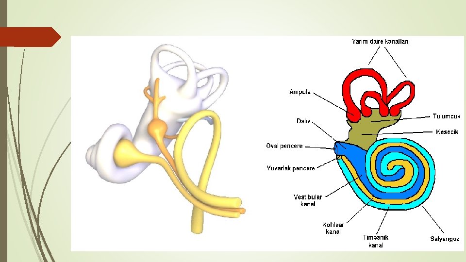 Kohlea : Salyangoz Kanalların içinde perilenf sıvısı vardır. Kohlea bir eksen etrafında 2. 5 defa kıvrılmıştır. 3 çeşit kanaldan oluşur.