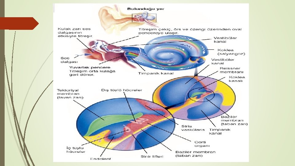 a. Vestibüler kanal Kohleanın üst kısmında yer alır. Oval pencereden gelen titreşimleri taşır. b. Timpanik kanal Kohleanın alt kısmında yer alır. Vestibüler kanaldan gelen titreşimleri, yuvarlak pencereye taşır. Yuvarlak pencerenin titreşimi ile temel zardaki titrek tüyleri uyarır. c. Kohlear kanal Vestibüler ile timpatik kanal arasında yer alır. Titreşimleri, titrek tüyler ile sinirlere aktarılmasını sağlayan, işitme organı olan kortinin bulunduğu yerdir. İçinde endolenf sıvısı vardır.