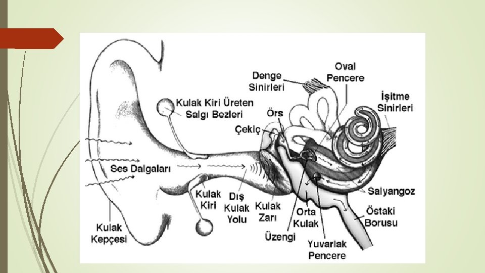 Dış Kulak: Kulak kepçesi , kulak yolu ve (kulak zarından) oluşmuştur. Kulak kepçesi , ses dalgalarını toplar ve sesin geldiği yönü belirler. Kulak yolu ses dalgalarını, kulak zarına iletildiği yerdir. Kulak zarı da dış kulak ile orta kulak arasında bulunan gergin bir zardır. Ses dalgaları ile titreşir ve orta kulağa geçer.