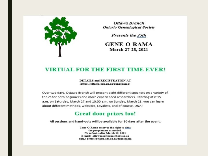 Ontario Ancestors’ Virtual Events Many other branches of Ontario Ancestors are offering online presentations as we battle through the pandemic. Most are open to everyone, so please encourage friends who may be interested to register too! Check out the calendar at https: //ogs. on. ca/eventscalendar/