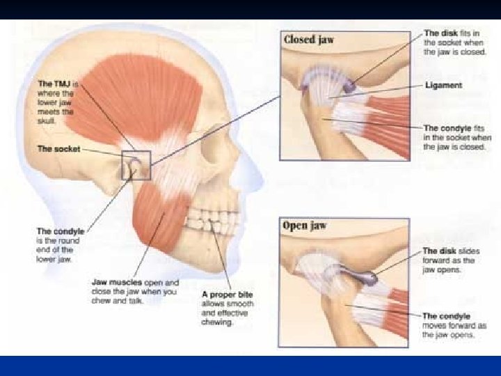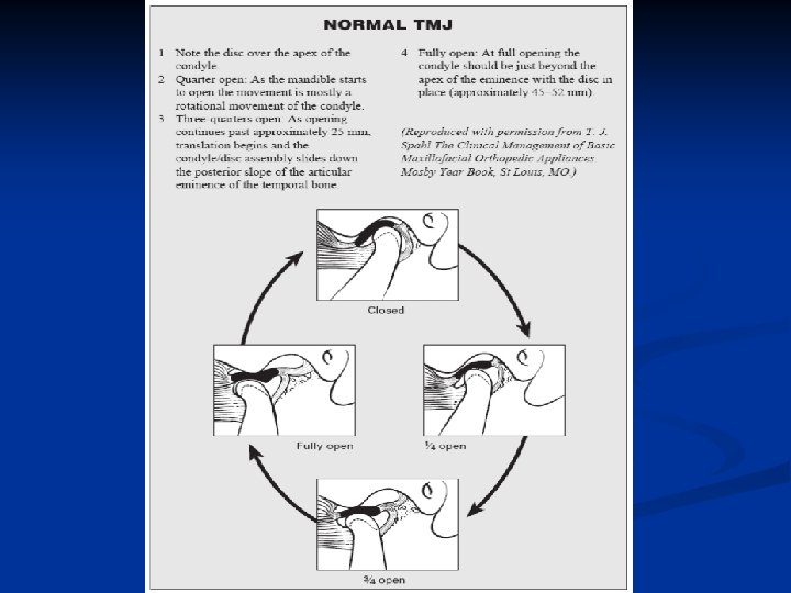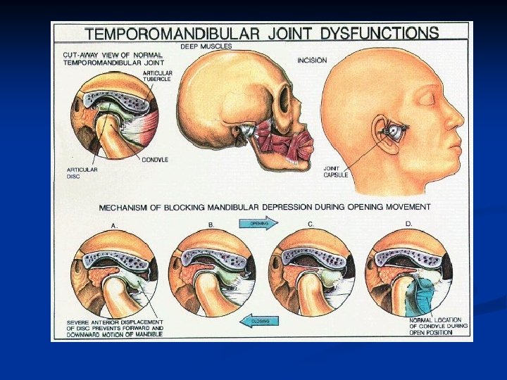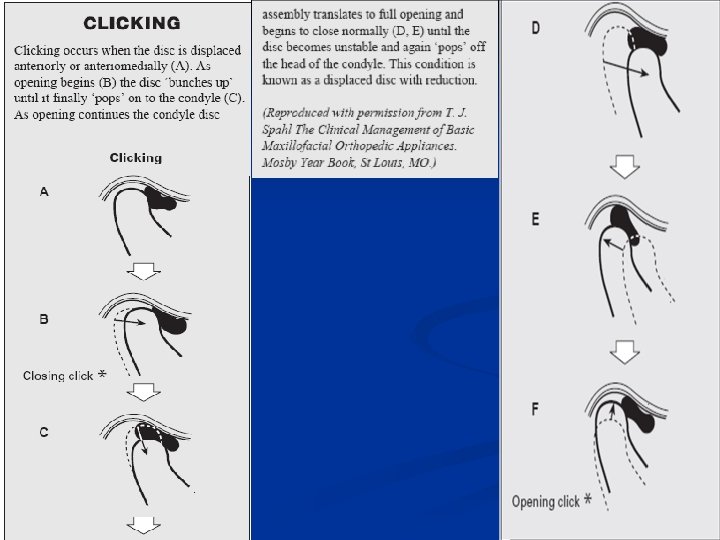 Facts on TMJ n n n Most soft clicking noise are not an indicator of joint dysfunction and are of no clinical significance Loud clicking while opening, with deviation present on opposite side, clinically significant of possible anterior condyle displacement. Loud clicking while closing, with deviation present on opposite side, clinically significant of possible posterior condyle displacement. Signs/Symptoms of TMD