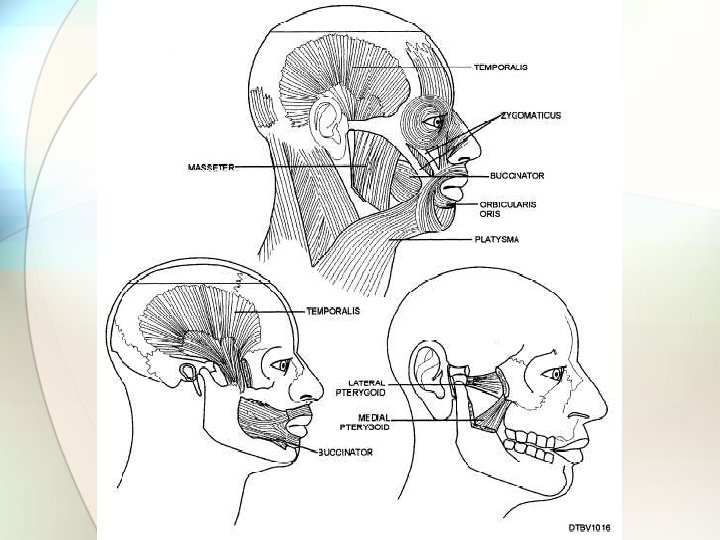 TMJ Muscles Temporalis closes jaw and retracts mandible n Masseter – closes jaw n Internal or medial Pterygoid – closes jaw n External or lateral Pterygoid – opens jaw, moves jaw side to side and protrudes mandible n