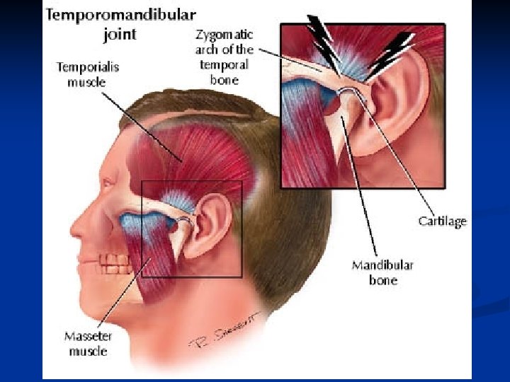 The most common type of TMJ disorder is myofascial pain and dysfunction, usually as a result of bruxism and jaw clenching n Related to stress, anxiety, depression or chronic pain n 3 cardinal features of TMJ are orofacial pain, restricted jaw function and noise in the jaw n