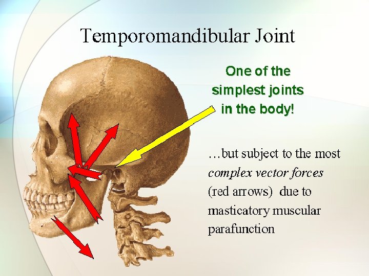 TMD reflects possibilities of involvement of other factors, not just the joint capsule n Occlusal factors n Intrajoint dysfunction n Psychological factors n Biochemical factors n Skeletal misalignments n