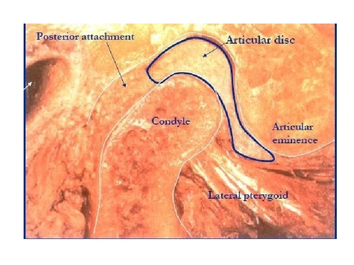 Articular surfaces Mandibular components -Condyle of mandible Temporal component - Articular eminence of temporal bone -Articular fossa of temporal bone Articular Disc • Made up of fibro cartilage Anterior band Intermediate band (thinnest) Posterior band Posterior bilaminar zone (highly vascular and innervated) Anterior end- attachment of upper head of LP