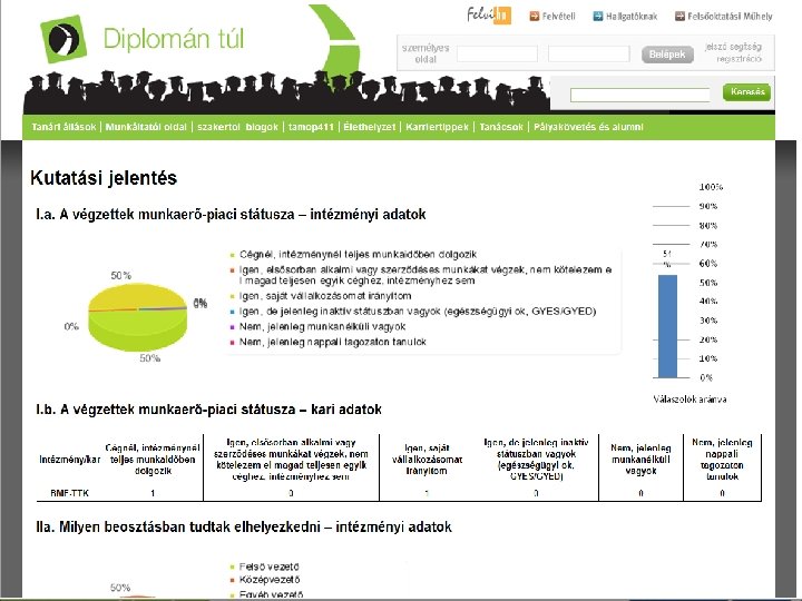 Mivel segítjük az intézményeket? Egy helyre gyűjtjük a pályakövetéses gyakorlat eddigi tapasztalatait. Elérhetővé tesszük a kutatások eredményeit. Hirdetjük a pályakövetés gyakorlatát a felvételi folyamattól kezdve. Ösztönözzük a felhasználókat a pályakövetésben való részvételre. (A pályakövetés és az intézményi karrierirodás kontaktok hirdetése, kereshető adatbázisa. ) Megjelenítjük az intézményi pályakövetéses, karrierirodás híreket (igény esetén). Szakmai szolgáltatások (online sorvezető, gyik, help desk)