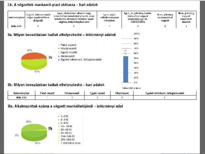 DPR központi adatbázis (FIR-APEH-OEP-FSZH) FIR (végzettek, továbbtanulók egyetem, főiskola, végzés éve 1. lépés: adatbázisok összekapcsolása a 2007. CI. tv. alapján külföldi tanulmányok, képzés helye APEH OEP születési név (munkavállalók, munkáltató) Jövedelem START kártya Munkáltató adatai anyja neve születési hely születés ideje FSZH (munkavállalók, munkáltató) Munkakör Biztosítási jogviszony Munkáltató székhelye Teljes vagy részmunkaidő (munkanélküliek) Regisztrált álláskereső foglalkoztatási támogatások 2. lépés: személytelenített tanulmányimunkaügyi DPR adatbázis létrehozása 3. lépés: statisztikai elemzések, tájékoztatás (web), vezetői riportok