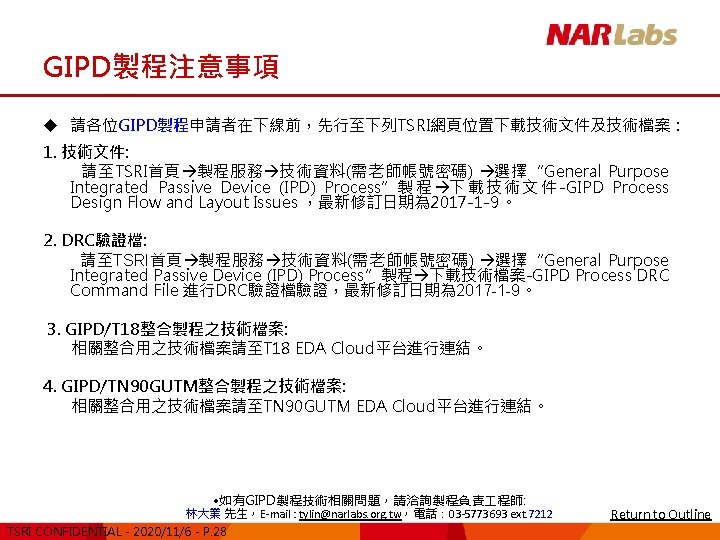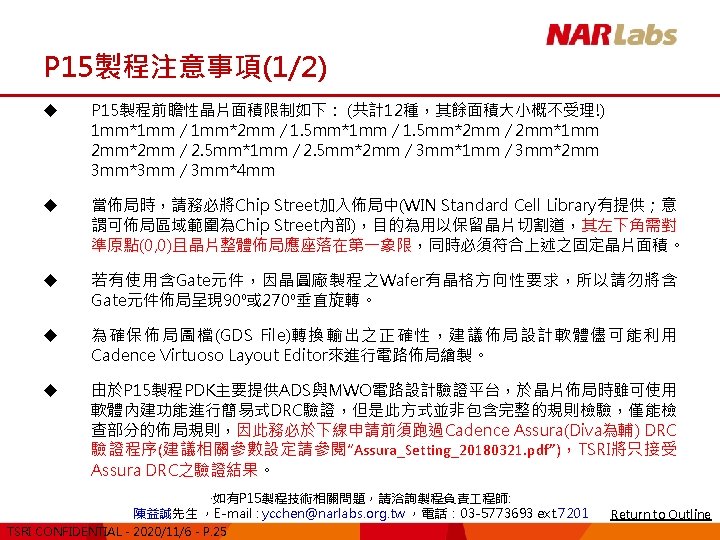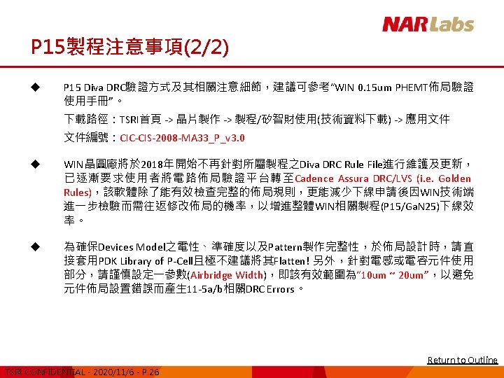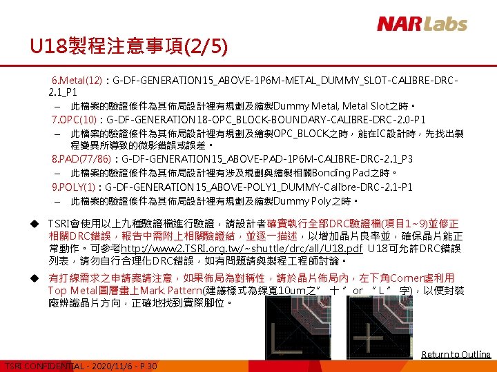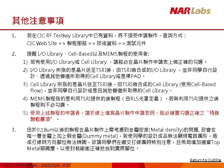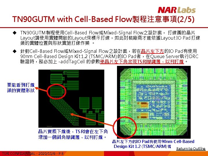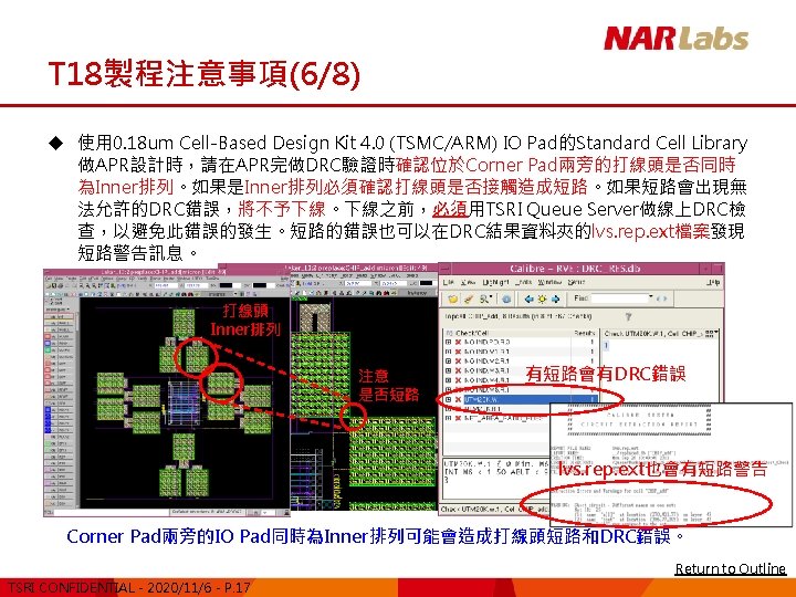 T 18製程注意事項(4/8) 要能看到打線 頭的實體形狀 晶片實際下線後,左下角將出 現CIC辯識層,以利打線。 晶片左下方的IO Pad有使用 0. 18 um Cell-Based Design Kit 4. 0 (TSMC/ARM) IO Pad者 Return to Outline TSRI CONFIDENTIAL - 2020/11/6 - P. 15