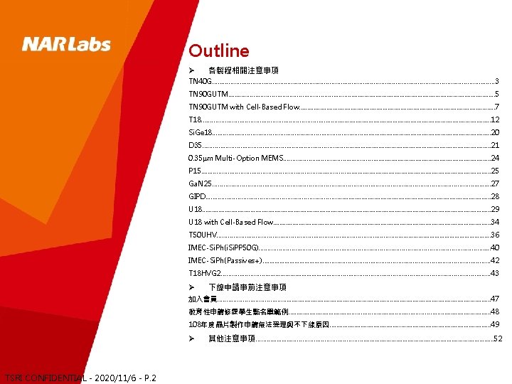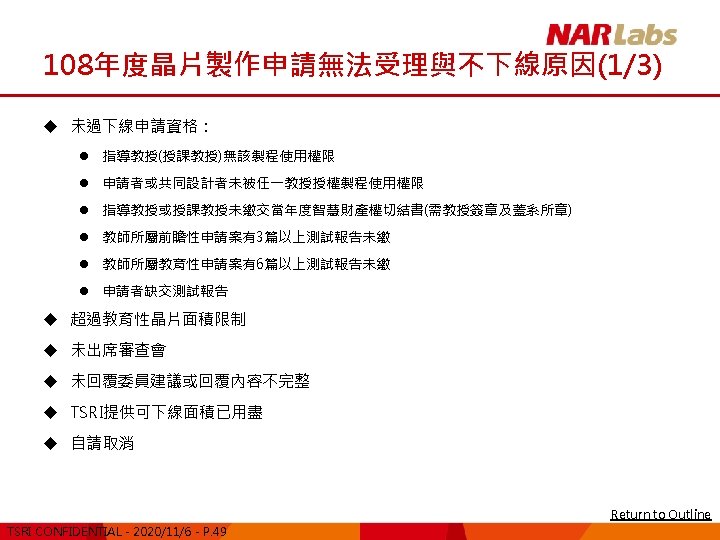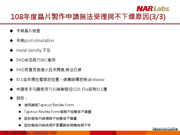 108年度晶片製作申請無法受理與不下線原因(2/3) u 未上傳檔案或上傳檔案不完整: l 未上傳GDS檔 l 未上傳LVS檔 l 未上傳drc summary檔 l 未上傳Tapeout Review Form l 未上傳設計報告電子檔 u DRC Error u 替換I/O後發生DRC Errors u IO Pad rename, 以致無法替換IO Pad u 用錯DRC file u 佈局檔無電路佈局 u LVS Error(Source and layout refer to the same data) Return to Outline TSRI CONFIDENTIAL - 2020/11/6 - P. 50
