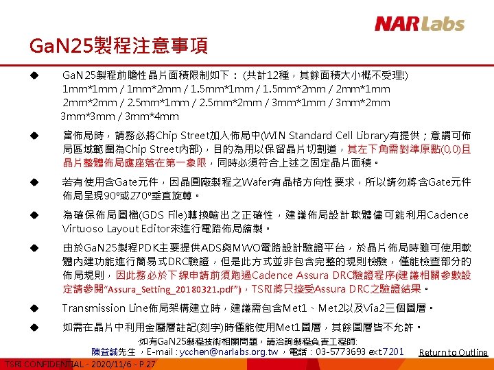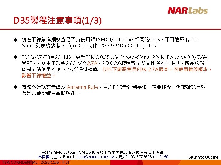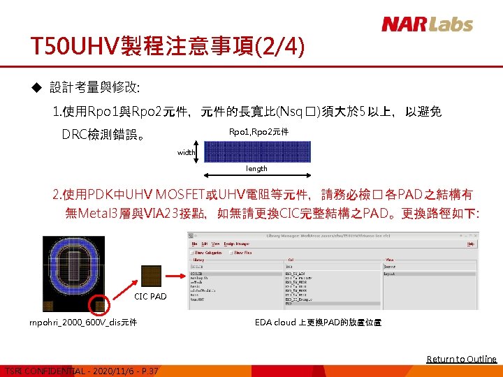 T 50 UHV製程注意事項(1/4) u 本製程為TSMC 0. 5 UM CMOS High Voltage Mixed Signal based LDMOS 5/20/450/600/700/800 V 2 P 3 M,polycide technology. 設計時Metal與元件使用,說明如下: 1. 實際Metal層數為 3層,請使用Metal 3作為Top Metal。 2. Metal的厚度分別為: Metal 1與Metal 2= 4 KÅ,Metal 3=30 KÅ (UTM)。 3. CPIP電容之單位容值為 1. 2 f. F/um 2。 4. UHV Device各元件耐壓不同,請務必留意操作電壓範圍。 5. 各元件之耐壓請參考technology file “T-05 U-CV-DR-010”。 6. PDK已經包含spice model,spectre model,calibre command file, 設計者可依EDA cloud 安裝介紹,解壓縮使用。 ●對於本製程之使用若有其他問題,請與負責 程師聯絡,聯絡方式如下: 蘇家寧小姐,電話: 06 -2087971 ext. 8221,E-mail : cn. su@narlabs. org. tw TSRI CONFIDENTIAL - 2020/11/6 - P. 36 Return to Outline