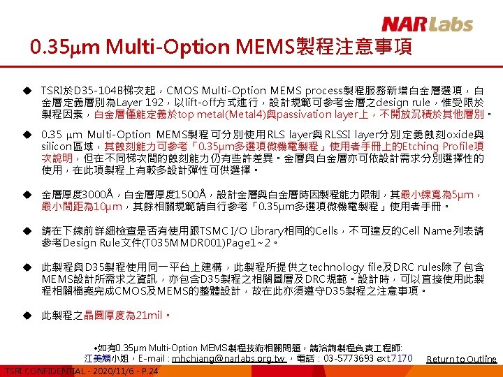 D 35製程注意事項(3/3) u 打線圖的晶片Layout,請使用Cadence Virtuoso或Synopsys Laker等Layout Editor開 啟的Layout來標示打線,勿以Cadence Innovus或Synopsys IC Compiler等APR Tool 開啟的Layout。 u 使用Cell-Based Flow之設計案,有打線需求之申請案請注意,TSRI會在佈局外左下角 處,用Metal 4畫上 ”L”形pattern,以便封裝廠辨識晶片方向,因此請確保上傳gds 檔及打線圖的佈局為同一方向,以免打線發生錯誤。 Return to Outline TSRI CONFIDENTIAL - 2020/11/6 - P. 23