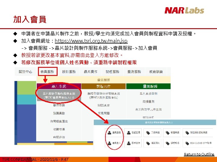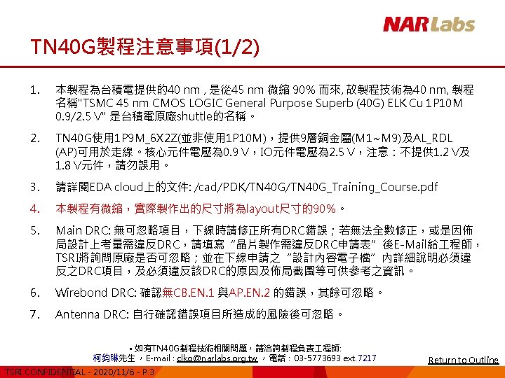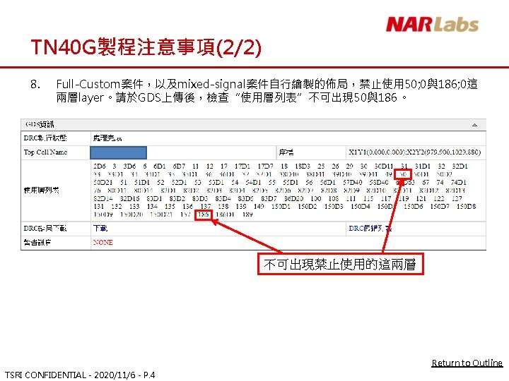 T 18製程注意事項(8/8) u 使用 0. 18 um Cell-Based Design Kit 4. 0 (TSMC/ARM) IO Pad的Standard Cell Library 做APR設計時,若有使用ROM,請確認該ROM的燒錄檔是UNIX或LINUX 作站以vi 編輯器編輯產生,以避免replace為真layout時產生問題。 Return to Outline TSRI CONFIDENTIAL - 2020/11/6 - P. 19