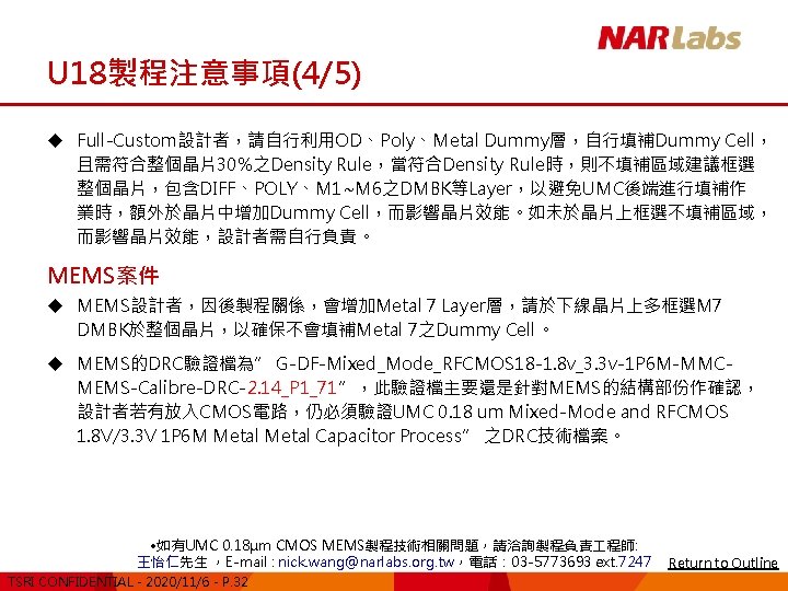 U 18製程注意事項(3/5) u 由於UMC製程之Dummy Cell填補方式與其它Foundry不同,設計者除自行填補於晶 片中。後端晶圓廠將會於Full Wafer上全部填滿包含Diff、Poly、M 1~M 6等Layer, MEMS案件則多M 7。 u 設計者不填補區域,需自行框選上識別Layer層,包含(DIFF、POLY、M 1~M 6之 DMBK),MEMS案件則多M 7 DMBK。 U 18(Virtuoso) U 18(Laker) GDS No. Data. Type DIFF_CAD(Dummy_Block) DIFDMBK(d 1) 70 1 PO 1_CAD(Dummy_Block) PLYDMBK(d 1) 71 1 M 1_CAD(Dummy_Block) M 1 DMBK(d 1) 72 1 M 2_CAD(Dummy_Block) M 2 DMBK(d 1) 73 1 M 3_CAD(Dummy_Block) M 3 DMBK(d 1) 74 1 M 4_CAD(Dummy_Block) M 4 DMBK(d 1) 75 1 M 5_CAD(Dummy_Block) M 5 DMBK(d 1) 76 1 M 6_CAD(Dummy_Block) M 6 DMBK(d 1) 77 1 M 7_CAD(Dummy_Block) M 7 DMBK(d 1) 78 1 TSRI CONFIDENTIAL - 2020/11/6 - P. 31 Return to Outline