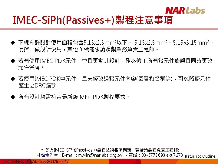 Si. Ge 18製程注意事項 u Si. Ge 18是以 3 P 6 M之鋁製程為主,專屬為Mixed-Signal Bi. CMOS製程。 u 在DRC驗證流程中,請必須確實執行以下驗證指令檔: (檔案版本僅以TSRI EDA-Cloud所提供為準) 1. Calibre. drc -- DRC deck for the main DRC rules 2. CLM 18 S_IMD_6 M. 10 a -- DRC deck for VIA array IMD crack rules 3. ant. drc -- DRC deck for antenna rules u 由於TSRI只有接受Flat模式的驗証結果,故於上傳佈局檔前請以Flat模式進行最後驗証! u 如同其它TSMC系列製程,Si. Ge 18 DRC驗證結果須符合Density Rules (POLY, M 1~M 6),設計者可善加利 用Dummy Pattern Generation Utility以輔助填補程序。 u 將填補之Dummy Cell置於Chip內部,應減少擺放至電路外側,以免造成多餘面積浪費。 u 本製程之PAD實現結構與Layout畫法,可參考技術文件“T 000 CLDR 002”。 u 當遇到不明之DRC Errors之時,一定要提出與 程師討論,請勿擅自合理化。 u 應避免使用INDDUMMY, EXCL等性質圖層框圍Whole Chip,此舉將會省略Density Rules Check。 u 如需在晶片中利用金屬層註記(寫字)時請同樣須遵守Design Rules。 u TSRI所提供之Si. Ge 18製程下線服務中,並無提供Cell-based Design Kit (Includes Standard Cell and I/O Cell Library)。 • 如有Si. Ge 18製程技術相關問題,請洽詢製程負責 程師: 陳益誠先生 ,E-mail : ycchen@narlabs. org. tw ,電話: 03 -5773693 ext. 7201 TSRI CONFIDENTIAL - 2020/11/6 - P. 20 Return to Outline