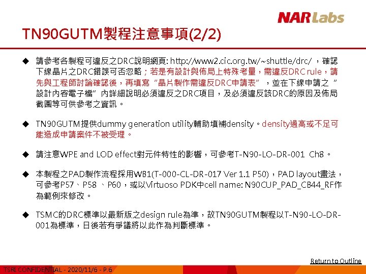 TN 90 GUTM製程注意事項(1/2) u TN 90 GUTM涵蓋RF、Analog、Mixed-Signal與Logic Circuit之電路應用需求, 提供使用Cell-Based Library,操作電壓為 1. 0 V/3. 3 V。 u TN 90 GUTM為 1 P 9 M(single poly, 9 metal layers)之銅製程,屬於General Purpose標準製程,Top Metal厚度為UTM (Ultra-thick Top Metal),僅有9層 metal可供佈線(M 1~M 9),並無M 10(=AP_MD)可用。所看到的AP層,僅會存 在PAD上(without RDL)不可用來佈線。 u 提供MOS、電阻、電感、電容的RF model,亦相容於一般Pure Logic製程。 MIM電容密度為 1. 5 f. F/μm 2。 u 晶片建議加上corner和seal ring保護晶片,防止切割造成損傷,TSRI已提供Lmark sample gds檔案,可依照layout大小,自行調整seal ring的長寬。Seal ring sample gds檔案路徑請參考EDA cloud檔案: /cad/PDK/TN 90 GUTM/PDK_TNGUTM. list,在virtuoso或laker匯入時,填入 檔案路徑即可匯入成layout cell。 • 如有TN 90 GUTM製程技術相關問題,請洽詢製程負責 程師 : 柯鈞琳先生,E-mail : clko@narlabs. org. tw,電話: 03 -5773693 ext. 7217 TSRI CONFIDENTIAL - 2020/11/6 - P. 5 Return to Outline