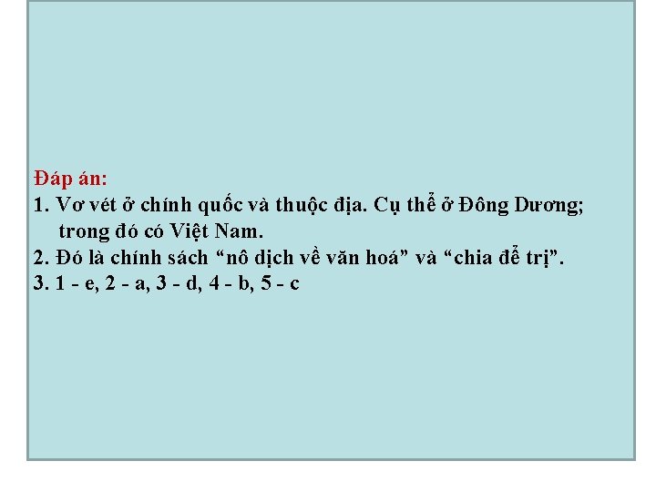 Câu hỏi củng cố: Câu 1. Sau chiến tranh, Pháp tăng cường khai thác thuộc địa ở đâu ? Câu 2. Pháp dùng các chính sách nào để cai trị về chính trị và văn hoá -giáo dục? Câu 3. Nối cột A với nội dung ở cột B để có câu trả lời đúng về thái độ chính trị xã hội của các giai cấp, tầng lớp ở Việt Nam sau chiến tranh thế giới thứ nhất. Cột A Cột B 1. Công nhân a. Hăng hái và đông đảo tham gia cách mạng. 2. Nông dân b. Có tư tưởng tiến bộ, hăng hái tham gia cách mạng. 3. Tư sản c. Một bộ phận cấu kết với Pháp, đàn áp phong trào nhân dân. 4. Tiểu tư sản d. Có tinh thần dân tộc, dân chủ nhưng dễ thỏa hiệp. 5. Địa chủ phong kiến e. Kiên quyết đấu tranh và là lực lượng lãnh đạo.