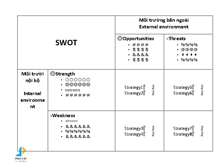 Tác động từ môi trường bên ngoài PEST Phân tích môi trường bên ngoài tác động đến hoạt động sản xuất, kinh doanh của doanh nghiệp Politics Chính trị • • • Các vấn đề chính trị Các quy định pháp lý và các quy định khác Thuế, … Economy Kinh tế • • • Tăng trưởng kinh tế , quy mô thị trường Tiền tệ, lạm phát, giảm pháp, lãi suất, tỷ giá, … Chu kỳ kinh doanh, … Social Xã hội • • • Đặc điểm nhân khẩu học tăng giảm dân số, phân phối độ tuổi trong dân số, giới tính , dân tộc. . . ) Văn hóa, quan điểm xã hội, xu hướng xã hội, Giáo dục An toàn và an ninh, Tôn giáo, ngôn ngữ, Môi trường tự nhiên • • • Công nghệ, Phát minh mới Chuyển giao công nghệ Bằng sáng chế, quyền sử hữu Technology Công nghệ