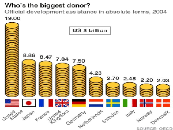 • Donations can come on the form of money, goods (food, weapons, water, medicine) or expertise (knowledge) • Aid may be given by individuals, private organizations, or governments. • The main recipients of development assistance are developing countries and the main contributors are developed countries.
