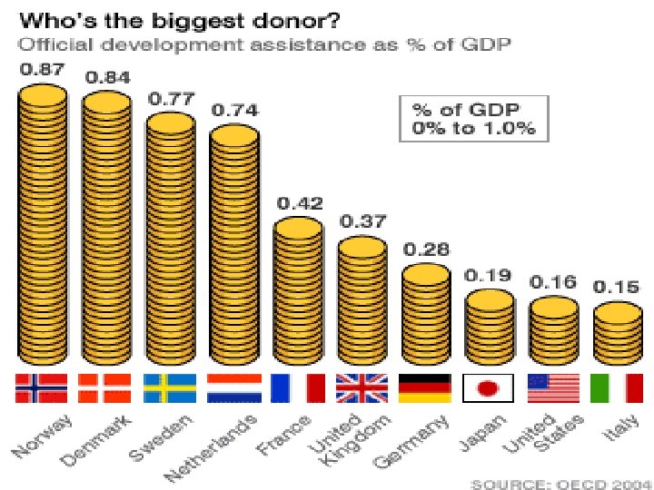 Canada’s Foreign Aid • Initially Canada was generous with aid, and likened to Scandinavian countries (Denmark, Finland, Norway, Sweden) • The U. N. has once again asked that the developed rich countries try and meet this target to help reach the Millennium Development targets of reducing poverty and hunger by half by 2015 • At present, Canada provides. 34% of its GDP in foreign aid • Canada’s GDP is $1. 4 trillion x. 7% = 10 billion dollars