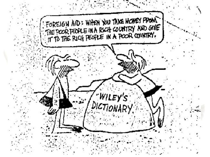 To Aid Or Not? • Many people feel that foreign aid is a band-aid solution to deeply rooted problems within the recipient countries, and instead of having an incentive to fix the problem, become dependent on handouts from the donor countries • Some countries also suffer from aid fatigue, whereby they see that no real progress is made within a country from to which aid is provided, and start to question if aid is still necessary