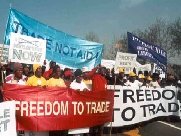 Trade, Not Aid • Other critics contend that instead of aid, developed nations should lift trade or economic pacts between rich nations as they often isolate the poorest countries, thereby keeping them in poverty. • Focus on fair trade vs. free trade