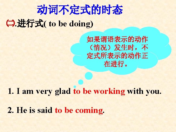 动词不定式的时态 ㈢. 完成式(to have done) 如果谓语表示 的动作发生在 不定式之前。 1. I am sorry to have kept you waiting so long. 2. You seemed to have read the novel written by Mr. Smith.