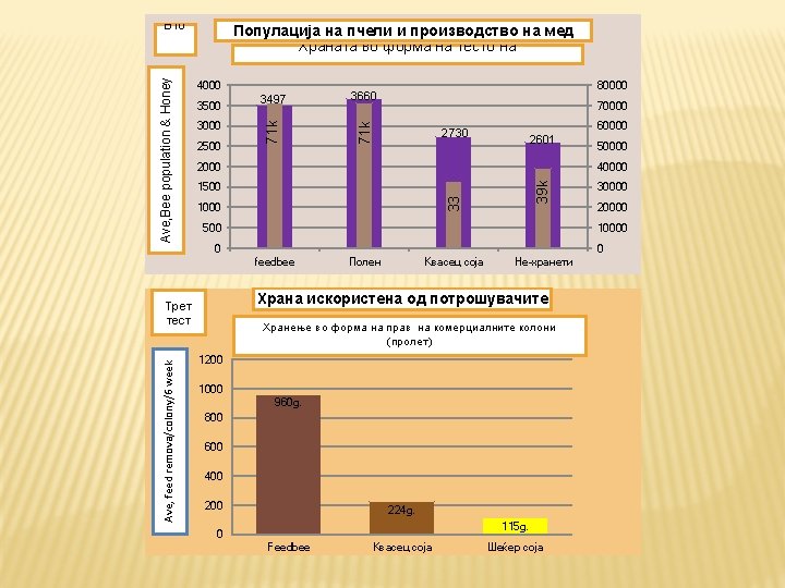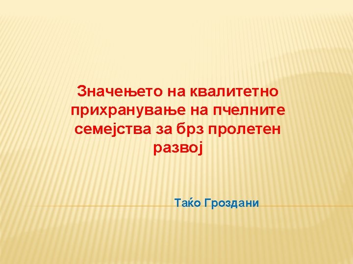 Zo{to imame zimski gubitoci na p~elnite dru{tva? Krajot na zimata i po~etokot na proleta e period koga vremenskite priliki se nestabilni, prosledeni so ~esti promeni i vremenski nepriliki i poradi toa ne e ovozmo`en postojan dotur na hrana od prirodata. Poradi toa razvojot na p~elnata zaednica vo golema mera zavisi od zalihite na hrana od prethodnata godina. Dokolku se tie pod nekoja kriti~na masa p~elite }e go odlo`uvaat razvojot na legloto. Takvite dru{tva nema da postignat potrebna proizvodna snaga. Ako zalihite se na kriti~na granica so pomo{ na p~elarot mo`e da se o~ekuva zaednicata zadovoluva~ki da se razviva. Samo dru{tvata kade zalihata na hrana ja ima dovolno i e nad kriti~nata masa }e go razveselat p~elarot so nivniot eksploziven razvoj nezavisno od vremenskite uslovi. §Зимските пчели §Временските услови §Соодносот на залихите