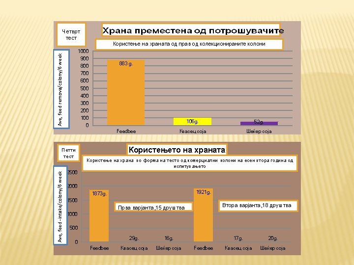 Op{ti soveti v. Pri prihranuvaweto na p~elite so fit-bi na krajot na zimata koga p~elite ne mo`e da izleguvaat od ko{nicata treba da se vodi smetka tie da imaaat i rezervna hrana-med ili vo kraen slu~aj treba da im se dade i drug vid na hrana (pриродна-мед). v. Na krajot na zimata isklu~ivo se prepora~uva hranewe so poga~i. v. Vo tekot na pripremata na Fidbi poga~ite ili sirupot ne se koristi vrela voda bidej}i so toa }e se o{tetat proteinite, vitaminite i drugite supstancii vo nego. v. Vo tekot na skladiraweto na hranata poradi bogatiot sostav so proteini mo`no e da se javi fermentacija {to ne e po`elno za ponatamo{noto davawe na poga~ite ili sirupot. v. Sve`o dadenite poga~i i sirup go namaluvaat rizikot od fermentacijata, pri {to na p~elite im se davaat porcii vo koli~ini za koi smetame deka }e gi potro{at vo tekot na 1 do 2 dena, a so toa se namaluva i rizikot od fermentacijata. Dosega{noto na{e iskustvo uka`uva na toa deka prvite znaci na fermentacija kaj prigotvenite poga~i se javuvaat po 4 meseci, a kaj sirupot posle 2 do 3 nedeli. v. Kaj mnogu slabite dru{tva od 1 do 2 ulici ne se prepora~uva upotreba na fitbi. v. Do upotrebata fitbi se ~uva na suvo i ladno mesto. Dokolku otvorenata vre}a ne se upotrebuva podolgo vreme treba da se ~uva od vlaga. v. Vre}ite koi se ~uvaat treba da se za{titeni od glodari i molci.