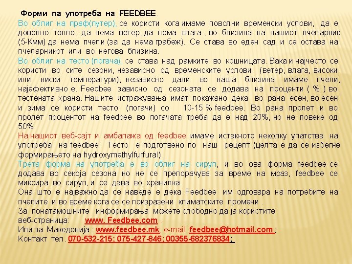 Sostav na fidbi Isklu~ivo sodr`i rastitelni derivati. Ne sodr`i: polen, soja, `ivotinski proizvodi, hemikalii, genetski modificirana hrana, lekovi, ve{ta~ki boi, ve{ta~ka aroma, konzervansi, dopolnitelen {e}er. Sostojki: proteini 36, 4 %, masti 3, 9 %, jagleni hidrati 41, 8 %, {e}er 10 %, minerali 3, 1 %. Pakuvawe i garancija na proizvodot vo hartieni vre}i od 10 i 20 kg, se ~uvaat na ladno i suvo mesto, a garancijata i rokot na upotreba e do 2 god. (go ima i kako beefodio)