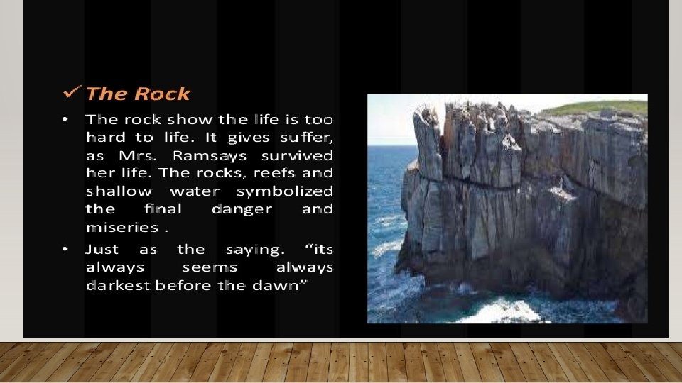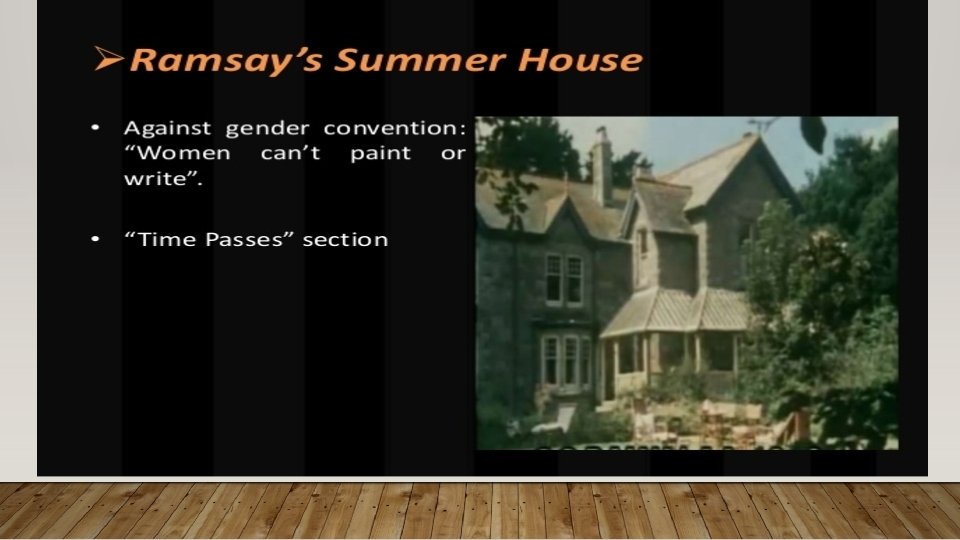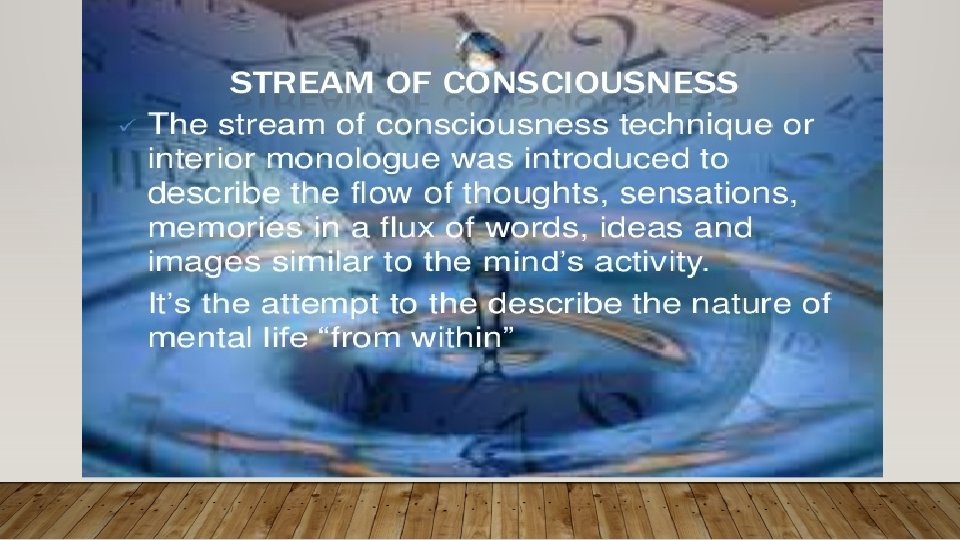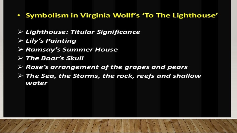 DIFFERENCE BETWEEN STREAM OF CONSCIOUSNESS AND INTERIOR MONOLOGUE • Although interior monologue is another term often used to refer to stream of consciousness technique, an important difference exists between the two. • Both stream of consciousness and interior monologue describe a character’s interior life. • But in interior monologue: the writer uses the character’s grammar and syntax. • In stream of consciousness technique: the character’s thoughts are transcribed directly, without an authorial voice acting as mediator. • Woolf does not make use of interior monologue; throughout To the Lighthouse. She maintains a voice distinct and distant from those of her characters. The pattern of young James’s mind, for instance, is described in the same language as that of his mother and father.