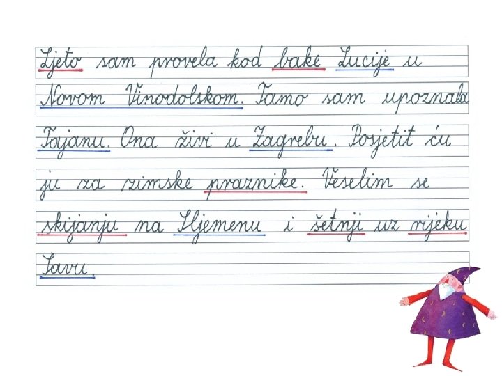Prepiši pravilno zadani tekst. Podcrtaj imenice (opće crvenom, vlastite plavom bojom). ljeto sam provela kod bake lucije u novom vinodolskom. tamo sam upoznala tajanu. ona živi u zagrebu. posjetit ću ju za zimske praznike. veselim se sanjkanju na sljemenu i šetnji uz rijeku savu.