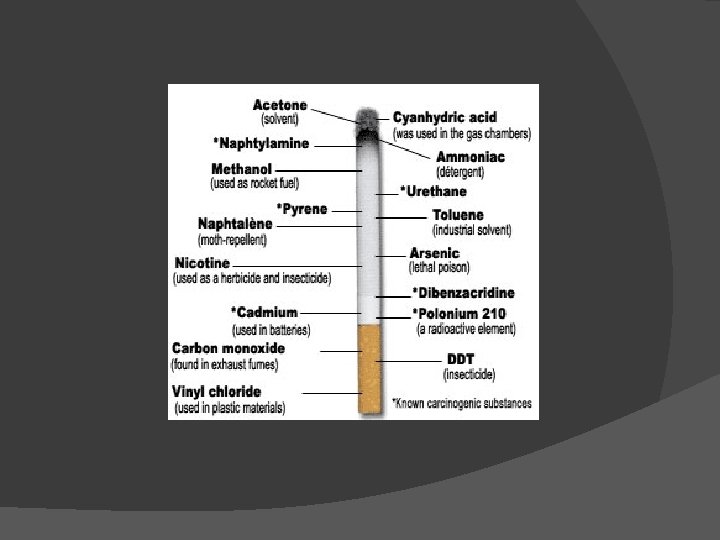 Nicotine The crucial ingredient in tobacco, responsible for psychoactive and cardiovascular effects and dependence It is a bitter, colorless, and highly poisonous alkaloid that acts as a powerful insecticide Average cigarette contains 12 -14 mg of nicotine, but only delivers 1 -3 mg to the lungs (one chew of tobacco delivers ~4. 5 mg of nicotine) ○ Average nicotine yield increased from 1. 65 mg/cigarette in 1999 to 1. 89 mg/cigarette in 2011 ○ Not due to agricultural variations