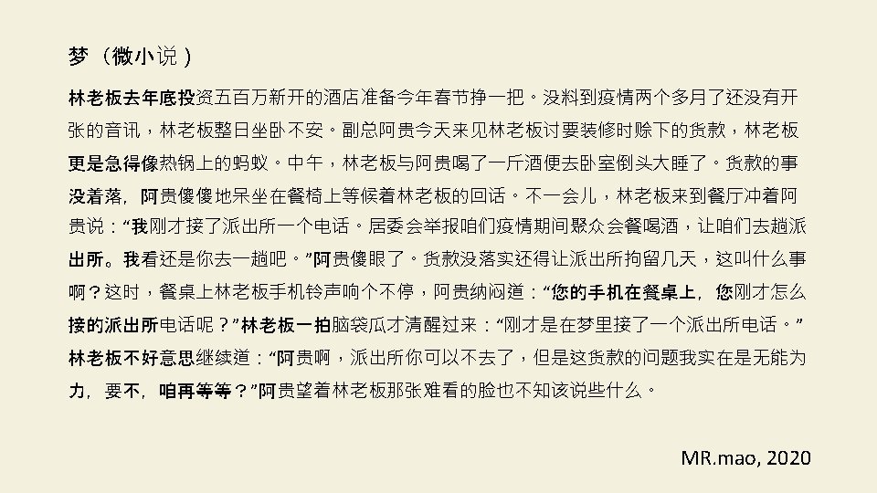 Today we will be translating a story 梦 about Covid-19 by a man known online as MR. mao who lives in the city of Taiyuan. Between January and March of 2020, all of China was in lockdown because of Covid-19. Many ordinary people amused themselves by writing and posting stories on the internet. Taiyuan