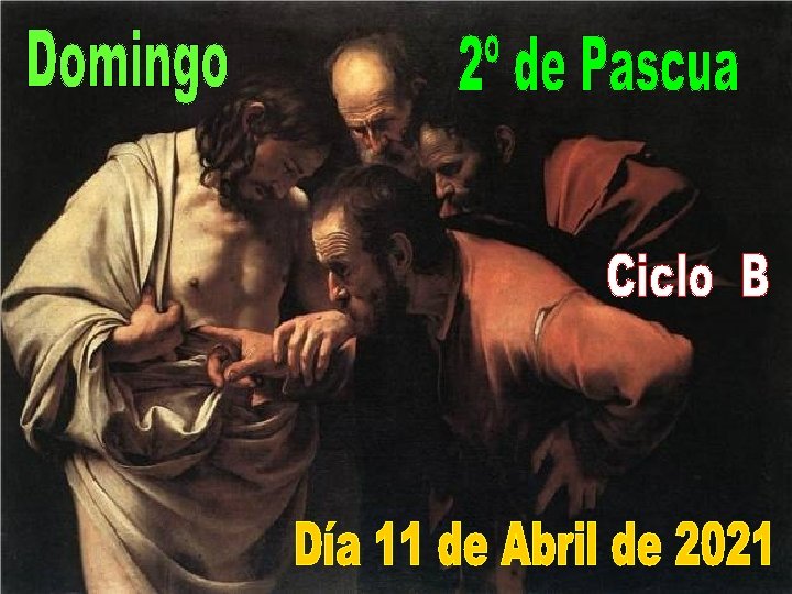 Al anochecer de aquel día, el primero de la semana, estaban los discípulos en una casa, con las puertas cerradas por miedo a los judíos. Y en esto entró Jesús, se puso en medio y les dijo: "Paz a vosotros. " Y, diciendo esto, les enseñó las manos y el costado. Y los discípulos se llenaron de alegría al ver al Señor. Jesús repitió: "Paz a vosotros. Como el Padre me ha enviado así también os envió yo. " Y, dicho esto, exhaló su aliento sobre ellos y les dijo: "Recibid el Espíritu Santo; a quienes les perdonéis los pecados, les quedan perdonados; a quienes se los retengáis, les quedan retenidos. " Tomás, uno de los Doce, llamado el Mellizo, no estaba con ellos cuando vino Jesús. Y los otros discípulos le decían: "Hemos visto al Señor. " Pero él les contestó: "Si no veo en sus manos la señal de los clavos, si no meto el dedo en el agujero de los clavos y no meto la mano en su (Sigue) costado, no lo creo. "