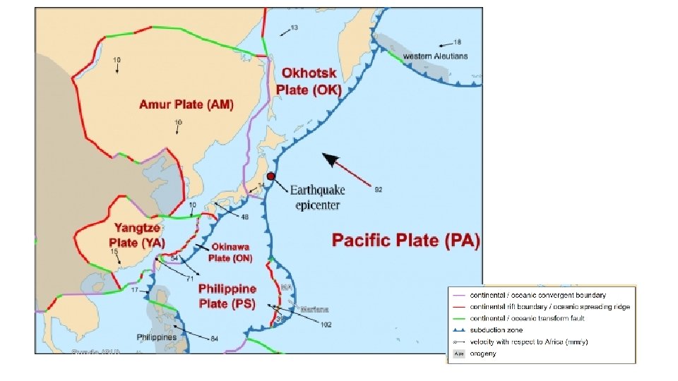 Tectonic Summary The March 11, 2011, M 9. 1 Tohoku earthquake, which occurred near the northeast coast of Honshu, Japan, resulted from shallow thrust faulting on the subduction zone plate boundary between the Pacific and North America plates. At the location of this earthquake, the Pacific plate moves roughly westward relative to the North America plate at a velocity of 83 mm/yr, and begins its westward descent beneath Japan at the Japan Trench, east of the March 11 th earthquake. Note that some authors divide this region into several microplates that together define the relative motions between the larger Pacific, North America and Eurasia plates; these include the Okhotsk and Amur microplates that are part of North America and Eurasia, respectively. The location, depth (about 25 km), and focal mechanism solutions of the March 11 th earthquake are consistent with the event having occurred on the subduction zone plate boundary. Modeling of the rupture of this earthquake indicates that the fault moved as much as 50– 60 m, and slipped over an area approximately 400 km long (along strike) by 150 km wide (in the down-dip direction). The rupture zone is roughly centered on the earthquake epicenter along strike, while peak slips were up -dip of the hypocenter, towards the Japan Trench axis. The March 11 th earthquake was preceded by a series of large foreshocks over the previous 2 days, beginning on March 9 with a M 7. 4 event approximately 40 km from the epicenter of the March 11 th earthquake, and continuing with another three earthquakes greater than M 6 on the same day. The Japan Trench subduction zone has hosted nine events of M 7+ since 1973. The largest of these, a M 7. 8 earthquake approximately 260 km to the north of the March 11 th epicenter, caused 3 fatalities and almost 700 injuries in December 1994. In June 1978, a M 7. 7 earthquake 35 km to the southwest of the March 11 th epicenter caused 22 fatalities and more than 400 injuries. Large offshore earthquakes have occurred in the same subduction zone in 1611, 1896, and 1933 that each produced devastating tsunami waves on the Sanriku Coast of Pacific northeast Japan. That coastline is particularly vulnerable to tsunami waves because it has many deep coastal embayments that amplify tsunami waves and cause great wave inundations. The M 7. 6 subduction earthquake of 1896 created tsunami waves as high 38 m and caused 27, 000 fatalities. The M 8. 6 earthquake of March 2, 1933, produced tsunami waves as high as 29 m on the Sanriku Coast and caused more than 3, 000 fatalities. Unlike the recent M 9. 0 earthquake, the 1933 earthquake did not occur as the result of thrust faulting on the subduction zone plate interface, but rather within the Pacific plate just seaward of the Japan Trench. The March 11, 2011, earthquake was much larger than other post-1900 plate boundary thrust fault earthquakes in the southern Japan Trench, none of which attained M 8. A similarly sized predecessor may have occurred on July 13, 869, when the Sendai area was swept by a large tsunami that Japanese scientists have identified from written records and a sand sheet. Continuing readjustments of stress and related aftershocks are expected in the region of this earthquake. The exact location and timing of future aftershocks cannot be specified. Numbers of aftershocks will continue to be highest on and near to fault-segments on which rupture occurred at the time of the mainshock. The frequency of aftershocks will tend to decrease with elapsed time from the time of the mainshock, but the general decrease of activity may be punctuated by episodes of higher aftershock activity. Beyond the ongoing aftershock sequence, the earthquakes in Japan have not significantly raised the probability of future major earthquakes. While the probability of future large earthquakes far from northern Honshu has not increased, neither has it decreased; large global earthquakes will likely continue to occur just as we have observed in the past.