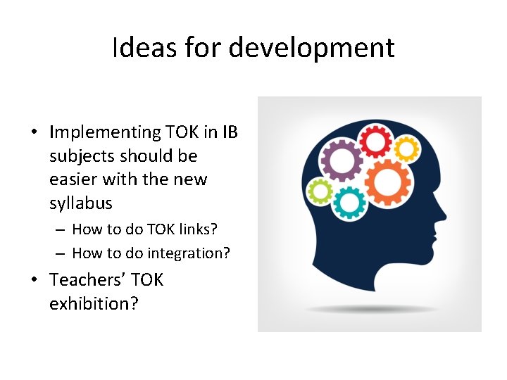 Ideas for development • Implementing TOK in IB subjects should be easier with the new syllabus – How to do TOK links? – How to do integration? • Teachers’ TOK exhibition?