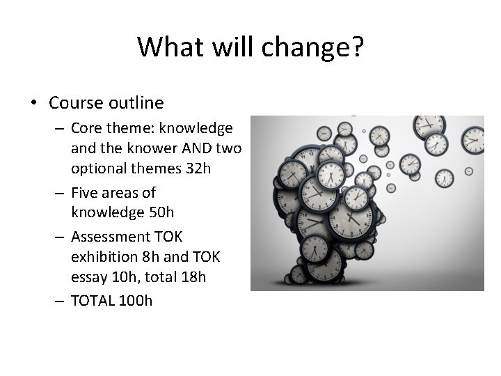 What will change? • Course outline – Core theme: knowledge and the knower AND two optional themes 32 h – Five areas of knowledge 50 h – Assessment TOK exhibition 8 h and TOK essay 10 h, total 18 h – TOTAL 100 h