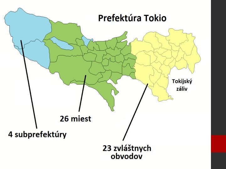 Členenie a poloha • Malé Tokio: 23 zvláštnych obvodov v prefektúre Tokio • Veľké Tokio: prefektúra Tokio + 3 ďalšie pref.