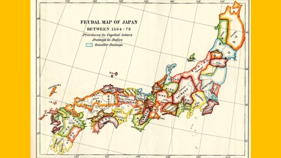 DO NOW: Read Introduction. Identify – who were the Tokugawa Shogunate Japan was thrown into warfare and chaos after centuries of peace. Many powerful daimyo (lords) constantly battled each other for control of territories. Japan was not united. It was split up into many territories. Then, a powerful daimyo named Tokugawa Ieyasu defeated all his enemies and unified Japan. Now, instead of many territories with many different leaders, the Japanese people had one ruler – the Tokugawa Shogun. This was a strong and central government. The Tokugawa family ruled Japan peacefully for the next 200 years.