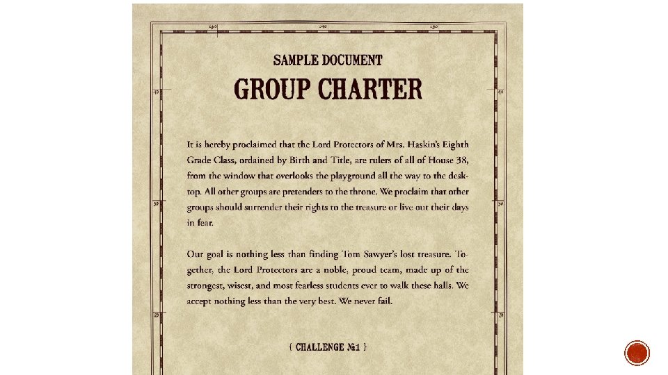 01 02 03 04 Each group will write a description of the group’s philosophy and will choose a location in the classroom as their home base. To pull up YOUR challenge, open your Bindle App, and click on the stack of challenge cards. At this point, only the first challenge should be available to you. Before each challenge you’ll probably have a new message from Tom and Huck. (MRS. FIGUEROA WILL PLAY ANIMATION 1)