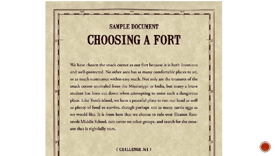 § Now as we think about this challenge, let’s break it down into steps. First let’s think about Tom, Huck, and Joe’s journey to the island in the middle of the Mississippi. What did they like about the island? FIRST CHALLENG E § So there a number of things that go into picking a place to establish a fort. Now let’s think about this room. Could someone give me a place they would like to set up a fort? And what about that place makes it a good fort? § Now when the next question asks what’s your philosophy, the question is asking what does your group believe. When Huck and Tom pretend to be pirates, they say their mission is to terrorize the high seas, and when Tom is trying to get a ticket at bible school he is trying to be an upstanding citizen. When you are looking for the treasure, what are things your team believes?