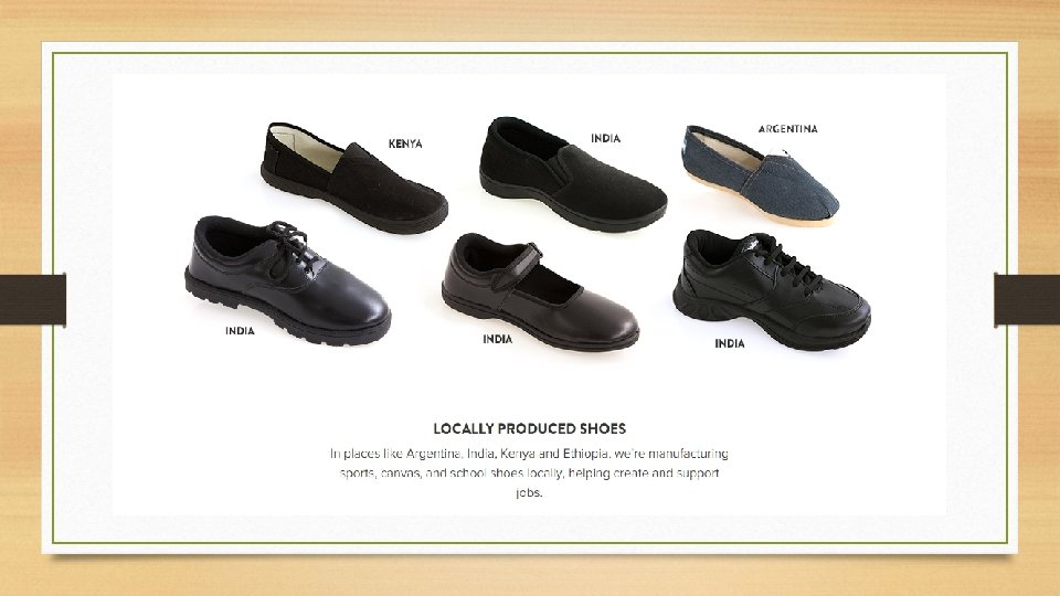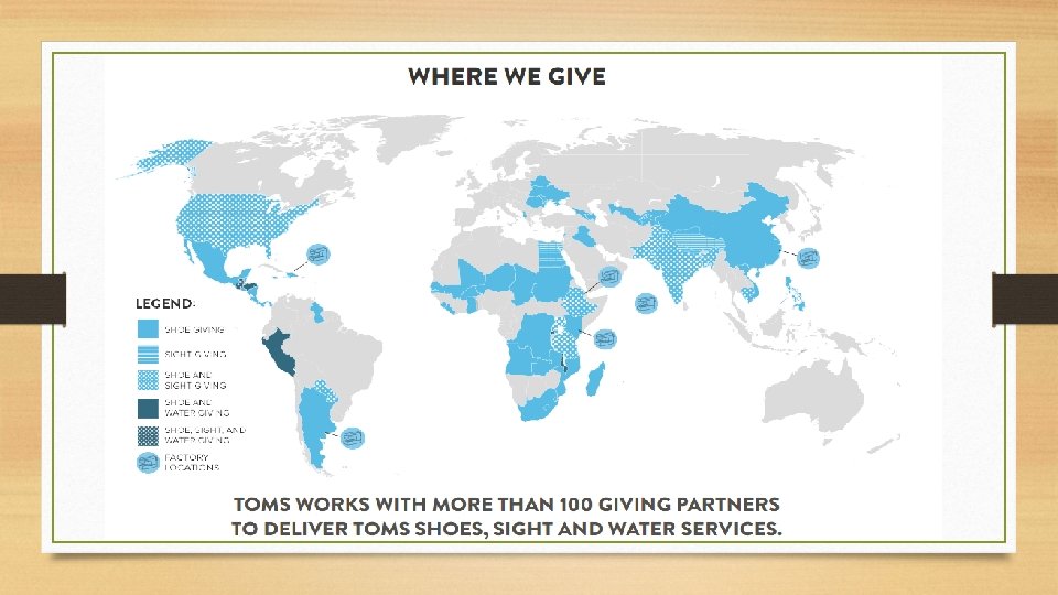 Criticism • Toms addresses a symptom, not the problem • Shoes only acknowledge one small element of the deeper poverty problem • Toms undercuts local markets • Local shoe makers have no chance when it comes to competing with Toms • Toms are way more costly than, easier and cheaper alternatives to problems in developing countries