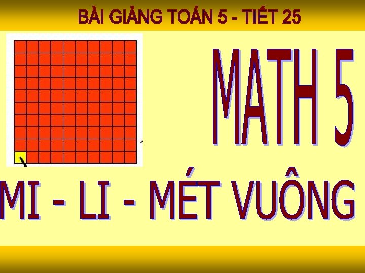 Toán: Mi-li-mét vuông. Bảng đơn vị đo diện tích a) Mi-li-mét vuông: 1 cm 1 mm 2 *Mi-li-mét vuông là diện tích của hình vuông có cạnh là 1 mm Mi-li-mét vông viết tắt là mm 2 *Ta thấy hình vuông 1 cm 2 gồm 100 hình vuông 1 mm 2 1 cm 2 = 100 mm 2 1 mm 2 = 1 100 cm 2