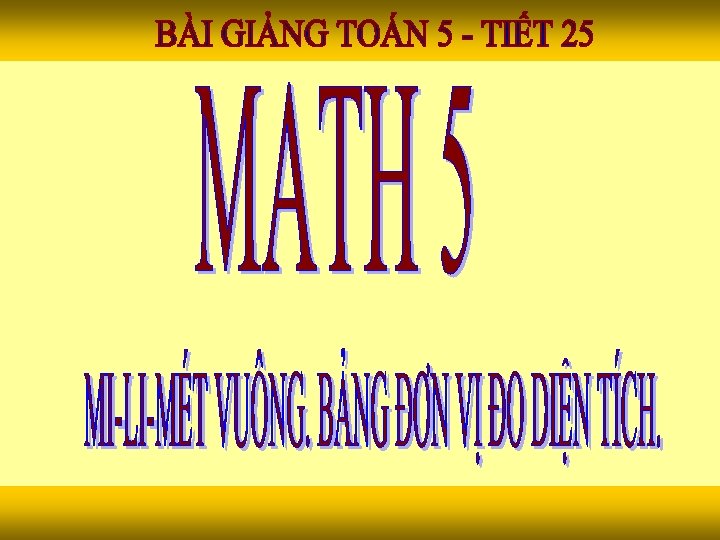 TOÁN : MI-LI-MÉT VUÔNG. BẢNG ĐƠN VỊ ĐO DIỆN TÍCH 1. Mi-li-mét vuông : 2. Bảng đơn vị đo diện tích : 3. Luyện tập : 4. Củng cố : Bài tập : Đúng – Sai ? * Mi-li-mét vuông là diện tích hình vuông có cạnh dài 1 mi-li-mét vuông. S * Mi-li-mét vuông là đơn vị đo diện tích bé nhất. Đ * 2 cm 2 = 20 mm 2 S * 750 mm 2 < 75 cm 2 Đ