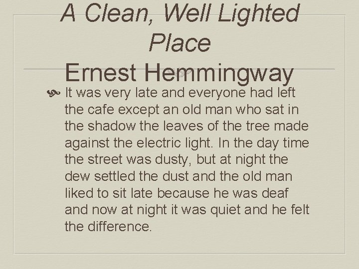 A Clean, Well Lighted Place Ernest Hemmingway It was very late and everyone had left the cafe except an old man who sat in the shadow the leaves of the tree made against the electric light. In the day time the street was dusty, but at night the dew settled the dust and the old man liked to sit late because he was deaf and now at night it was quiet and he felt the difference.