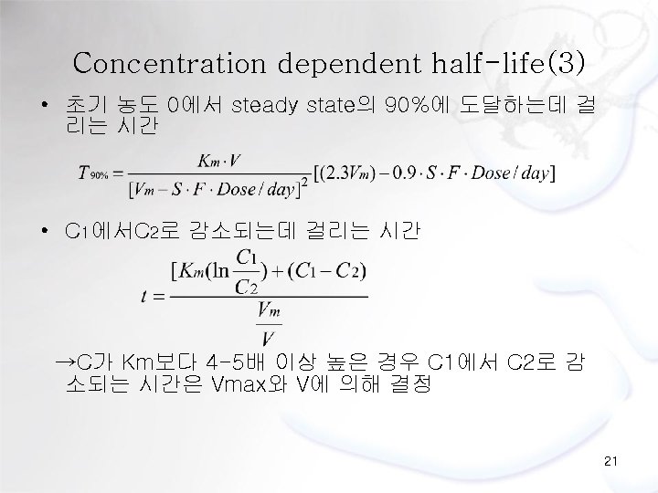 Concentration dependent half-life(1) • Phenytoin half-life 약 22 hrs이지만 농도 변함에 따라 clearance 변하므로 일정하지 않음 • Half-life 사용 한계 : capacity-limited metabolism이어서 steady state도달 에 요구되는 시간은 half-life의 3 -4배보다 더 길수 있고 maintenance dose의 중단시 약물 감소에 요구되는 시간 은 half-life에 의해 계산된 것보다 빠를 수 있다. 19