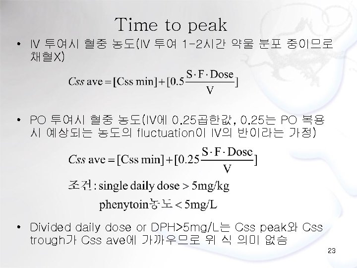 Sample collection • Therapeutic phenytoin concentration의 rapid achievement : 시작 2 -3일 내 TDM 시행, 3 -5 일 내 큰 변화없으면 once weekly • Stable patient : 3 -12개월 monitor • PO 복용 : 서방형 제제의 경우 fluctuation이 적 어 divided dosing으로 복용시 채혈 시간 의미 적음 • Resampling guidelines : 용량 변경시, 임상 증 상 조절되지 않거나 독성 의심시, interaction 약 물 복용시, hepatic or renal disease와 같은 DPH 대사를 바꾸는 질환 발현시, 임신, 약물 제 형 변경시 등 22